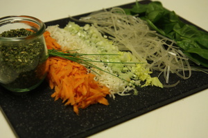 Všechnu zeleninu i nudle dáme do sklenice, osolíme, opepříme a přidáme polévkové koření. Vyvarujte se použití Vegety a podobným chemiemi nabitým lahůdkám. Polévkové koření, které potřebujete koupíte ve všech lepších marketech, nebo ještě lépe v prodejnách zdravé výživy. Já používám Sonnentor – polévkové koření – obsahuje petržel , libeček , pastiňák a majoránku.