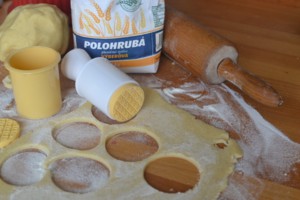 Na pracovní plochu nasypte trochu mouky, na které vyválíte z těsta plát vysoký asi 0,5 cm. Z tohoto plátu vykrajujte tvary, případně zdobte sušenkovým razítkem.