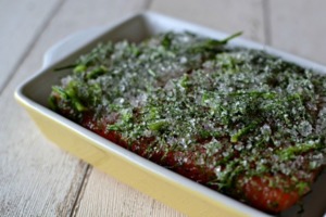 Sůl a cukr promícháme. Přidáme pepř a nahrubo nasekaný kopr. Polovinu této směsi vysypeme do hlubšího talíře. Položíme na lososa a pořádně přimáčkneme. Zbylou směsí lososa zasypeme a přikryjeme, také přitlačíme. Bude úplně celý schovaný pod krustou ze soli a cukru.
