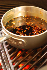 Připravte si bambusové nebo kovové jehly na špízy. Do hrnce bez plastových součástí (protože budete pracovat na grilu) dejte sojovou omáčku, mirin, cukr, med, česnek, zázvor. Položte na rozpálený gril a vařte15 minut. Často míchejte a dávejte pozor, aby se omáčka nepřipálila.