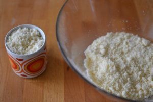 Ve větší míse smíchejte máslo, cukr a moukou. Z těchto tří surovin vznikne sypká drobenka. Jeden hrnek této drobenky si dejte stranou.
