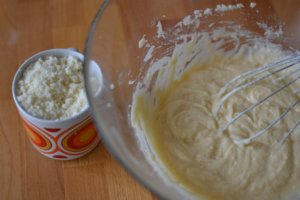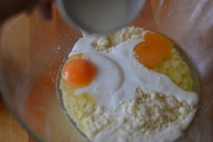 Do zbytku drobenky nejprve vmíchejte prášek do pečiva a vanilkový cukr. Přidejte vejce, mléko a pořádně promíchejte. Míchejte tak dlouho, až je těsto hladké.