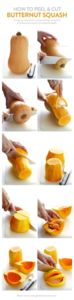 Máslová dýně vypadá jako velká hruška. Má světlou slupku a sytě oranžovou dužinu. Když ji rozkrojíte, možná vás překvapí, že vlákna a semínka nejsou v celé dýni, ale pouze v dolní rozšířené části. Slupku můžete snadno oloupat pomocí nože nebo škrabky. Do některých receptů, kam se používá dýně rozmixovaná, můžete dokonce použít dýni i se slupkou, jako Hokkaido. Pro většinu receptů však doporučujeme dýni oloupat.