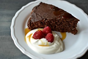Celý skvělý dezert ještě doladíte na talíři. Kopeček zakysané smetany, kterou nemusíte nijak ochucovat, čerstvé maliny a přelití javorovým sirupem. Nahoru na koláč můžete, ale nemusíte nalít čokoládovou polevu. Stačí vám na ni jedna rozpuštěná kvalitní čokoláda.