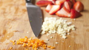 Chilli papričku opatrně rozkrojte napůl a vyškrábněte semínka. Nasekejte najemno. Jahody nakrájejte na kousky, česnek nasekejte najemno.