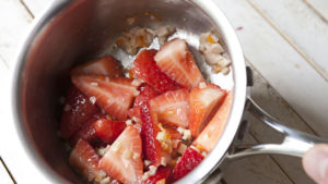 Papričku, česnek, zázvor a jahody dejte do hrnce s olivovým olejem a špetkou soli. Vařte dokud se jahody nezačnou rozpadat. Bude to trvat asi 6 - 7 minut.