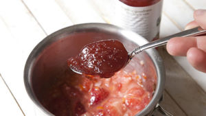 Přidejte marmeládu, sojovku, worcester a hořčičný prášek. Ztlumte teplotu a za stálého míchání vytvořte hladkou omáčku. Sundejte z plotny a nechejte lehce vychladnout. Potom rozmixujte dohladka ve food procesoru.