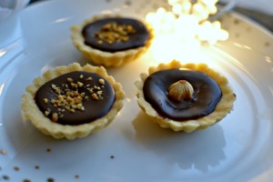 V hrnci přiveďte k varu smetanu. Odstavte z plotny a nalámejte do ní čokoládu. Nechejte stát pět minut a potom vyšlehejte metličkou. Touto horkou čokoládou zalijte karamel v ořechových košíčcích. Nahoru ozdobte lískovým oříškem, mandlí nebo nasekanými ořechy.
