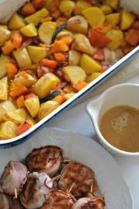 Pečte přiklopené v troubě vyhřáté na 160 °C, asi 25 minut. Potom odklopte a dopečte doměkka. Celková délka pečení záleží na velikosti kousků, které jste nakrájeli.