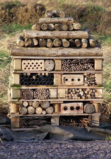 Do většího hmyzího hotelu dejte různé větve, kusy dřeva, do kterých navrtáte dlouhé otvory, smotanou slámu a seno, kusy kartonu. To všechno spojíte za pomoci drátků, provázků, nití.