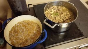 Po 3 hodinách odkryjeme , vylovíme kosti , kůže . Přidáme sůl, pepř , veškeré koření a česnek (stroužky stlačíme plochou stranou nože , tak až prasknou a krásně se rozvoní) a necháme odkryté velmi pomalu bublat další 3 hodinky. Tady platí čím déle , tím lépe. Poslední várku jsme vařili se vším všudy téměř 11 hodin.