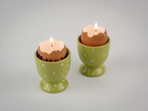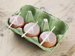 Skořápky, pěkně vyčištěné a s dostatečně odlámanými vršky, narovnejte do papírového kartonu na vajíčka. Skořápky můžou být klidně ozdobené, ale není to nutné. Svíčka nejlépe vynikne v porcelánovém stojánku na vajíčka.