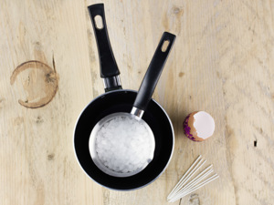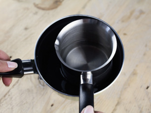 Připravte si vodní lázeň. Do většího hrnce vodu, do menšího parafínové pecičky. Rozpusťte je nad horkou vodou.