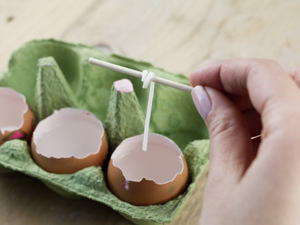 Knot nastřihejte na požadovanou velikost a namotejte konec na párátko. Ponořte do parafínu, až na dno skořápky.