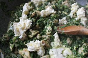 V hlubší pánvi osmahneme osolené a opepřené kuřecí kousky. Ty by měly být spíš menší, aby se dobře rolovaly do palačinky. Přidáme k nim nasekaný špenát a natrhanou mozzarellu. Necháme vše, aby se pěkně spojilo. Mozzarella se rozpustí a vznikne lahodná špenátová náplň.