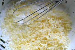 Smícháme nastrouhaný sýr a smetanu. Ochutíme solí a pepřem. Můžeme opět přidat nějaké čerstvé bylinky nebo špetku muškátového oříšku.