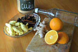 A tak jsem použila koření, které mi zbylo z karamelového kořeněného sirupu do svařeného vína a jako základ jsem připravila karamel. Pomeranče a citrony jsou další léčivá bomba, ještě k zázvoru a oblíbenému moravskému všeléku – slivovici.
