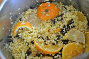 Až je všechen karamel rozpuštěný, přidáme do sirupu koření. Ještě chvíli, asi deset minut, povaříme, až se krásně rozvoní a zajistí vánoční vůni zázvorového likéru. Vypneme plotnu a do hrnce přidáme pomeranče a citrony důkladně omyté a nakrájené na plátky.