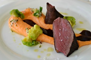 Kaštanový krém, bramborový tartar a zelný prach. Krémová polévka je mým vítězem ze zvěřinového menu. Byla naprosto dokonalá. Jemná chuť, příjemná vůně a finta se zelným prachem. Já tyhle srandičky prostě miluju. A miluju je o to více, když mě také zasytí. Když to není jen parádička, ze které si sednete na zadek, když ji vidíte dokonale nandanou na talíř, ale zároveň je to opravdové jídlo.