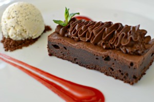 Nemám ráda portské. Zkoušela jsem ho už několikrát a byla jsem si jistá, že z nás kamarádi nikdy nebudou. Mýlila jsem se. Ferreira Porto, které jsme dostali k poslednímu chodu, dezertu, bylo výtečné. Nebylo však lepší než samotný dezert. Opět jasný důkaz toho, že v restauraci Vyhlídka se vaří z prvotřídních surovin. Protože čokoládový řez s pařížským krémem, byl tak čokoládový, že lepší už by to být nemohlo. Jemnou chuť doplnila maková zmrzlina a malinové coulis.