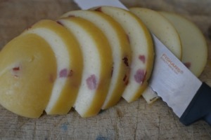 My jsme udili ve velkém. Celých dvanáct kilo sýra. Použili jsme velice dobrý eidam 30 %. Ale pozor při nákupu. Vybírejte opravdový mléčný sýr, nesmí obsahovat žádné rostlinné složky. Jen takový sýr je moc dobrý a nemá nic společného s gumovým bílým sýrem bez chuti, který koupíte často jako „eidam 30%“ v supermarketu.