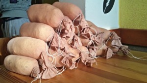 Ochucené sýry nacpěte do připravených silonek. Pořádně utlačte, co nejvíce to jde. Pevně zavažte, až těsně nad sýrem. Nechejte dost dlouhý provázek, za který se budou válce věšet do udírny.