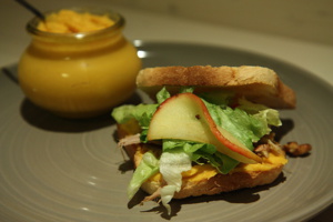 Na fotce je sendvič potřený dýňovým máslem a obložený pečeným masem a k tomu salát s jablky a šalvějí.