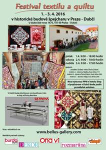 Zveme vás na Festival textilu a quiltu výstavu v historické budově špejcharu v Praze Dubči. Výstava bude věnována především textilu, šití, patchworku, quiltingu a jiným technikám, které se k textilu vztahují. A také právě v tomto období vyjde 50. číslo časopisu pro tvořivé a šití-milovné švadlenky – Švadlenka :-). Výstava proto bude i takovou malou oslavou tohoto časopisu.