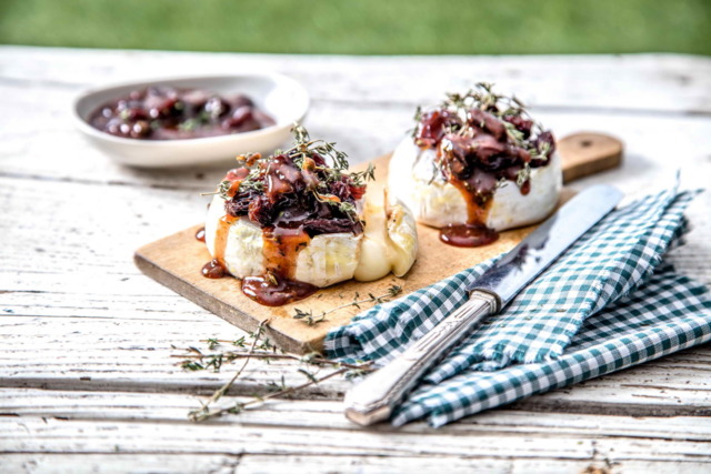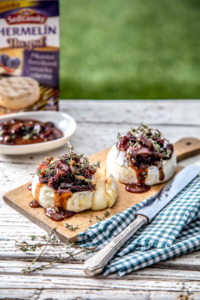 Připravte si misku, ve které smícháte švestkovou omáčku s jednou hrstí rozinek a k tomu přidejte lístky z jedné snítky tymiánu. Každý Hermelín dejte na alobal a posypte jej zbylými rozinkami a ke každému přidejte jednu snítku tymiánu. Zabalte do alobalu a grilujte asi 8 minut. Po vyndání z grilu každý hermelín přelijte švestkovou omáčkou a podávejte hostům.