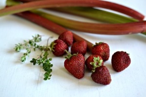 Mezitím co se předpéká korpus, tak si připravte ovoce. Jahody omyjte, očistěte a zbavte zelených částí. Rebarboru oloupejte nožíkem nebo škrabkou na zeleninu. Nakrájejte na malé kousky a s trochou vodu (asi 50 ml) a třtinovým cukrem dejte do malého hrnce uvařit doměkka. Přidejte také lístky tymiánu. Trvá to opravdu chviličku a rebarbora je hned rozvařená. To je přesně to, co potřebujete. Nechejte vychladnout.