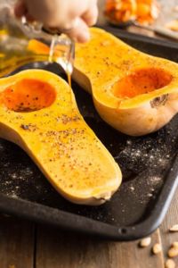Máslová dýně vypadá jako velká hruška. Má světlou slupku a sytě oranžovou dužinu. Když ji rozkrojíte, možná vás překvapí, že vlákna a semínka nejsou v celé dýni, ale pouze v dolní rozšířené části. Slupku můžete snadno oloupat pomocí nože nebo škrabky. Do některých receptů, kam se používá dýně rozmixovaná, můžete dokonce použít dýni i se slupkou, jako Hokkaido. Pro většinu receptů však doporučujeme dýni oloupat.