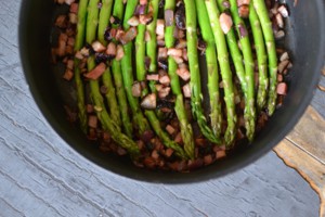 Cibuli nakrájejte nadrobno. Anglickou slaninu na malé kostičky. Chřest očistěte. Stačí odkrojit zaschnutý konec stonku. Ve velké pánvi rozpusťte kousek másla, na kterém osmahnete cibuli a anglickou slaninu dokřupava. Až je téměř hotov, přidejte na chvíli stonky chřestu, které jen lehce opečete ze všech stran.