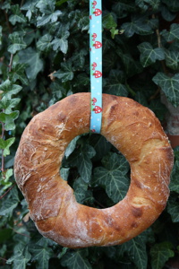 Těsto vyklopíme na pomoučený vál a vytvoříme bochánky. Shora pomoučíme a uprostřed uděláme díru. Vytvořený kruh přesuneme na plech, shora nařízneme a necháme ještě asi 20 minut kynout.