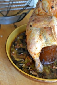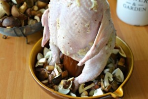 Takto připravené kuře vložíme do trouby, vyhřáté na 200 °C a pečeme asi 15 minut. Potom teplotu snížíme na 150 °C a pečeme ještě hodinu, klidně hodinu a čtvrt. Průběžně kuře poléváme šťávou, která se vypekla a teče rovnou mezi hříbky.