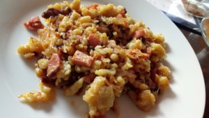 Okolo druhé hodiny se nám přeci jen poštěstilo a místo jsme našli. A ukázalo se, že se vyplatí čekat. Chcete-li výborné jídlo, milou a rychlou obsluhu a také příjemné posezení, směřujte své lyže na Zahrádky. Vystupte z lanovky a lyžujte směrem doprava a kousek dolů :-) Narazíte na starou horskou chatu s názvem Vraní bouda. Tady zapíchněte lyže do sněhu a vzhůru na gastronomické orgie!