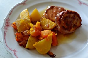 Jako přílohu k vepřovými medailonkům jsme zvolili brambory pečené s dýní a šalvějí. Výhodou této přílohy je, že se hodí k různým masům a peče se v troubě vlastně sama. Takže jedinou práci, kterou s ní máte, je nakrájet suroviny a nasypat je do pekáče. Potom máte čas připravit si medailonky a všechny je pěkně opéct na pánvi.