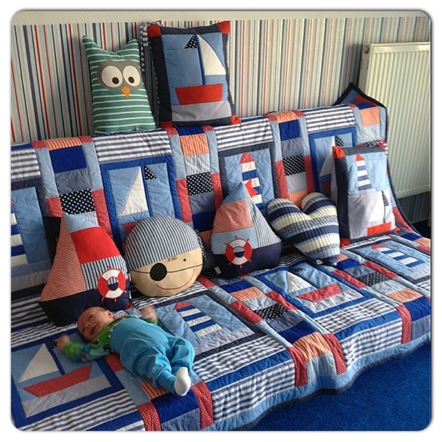 Postýlka je v pokoji od Lukynkova půl roku, do té doby spal u rodičů v ložnici. Námořnické mantinely jsou ušité na zakázku, Veru je střídá s domečkama v námořnických barvách. Povlečení opět a jedině s námořnickými motivy, ty na obrázku jsou z XXXLutz a jsou super kvalitní a příjemné. Na Lukáška dohlíží samolepka piráta, která je z Fleru. Girlanda zbyla z námořnické oslavy.