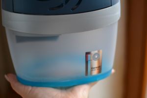 Jakmile se tableta vytratí, otevřete výpustný ventil, vylijte nahromaděnou tekutinu a vložte novou tabletu. Nádoba na tekutinu je průhledná, proto budete moci pravidelně kontrolovat její naplnění i účinnost přístroje. Zabudovaný bezpečnostní systém chrání váš domov před vylitím tekutiny při převrhnutí, proto můžete pohlcovač umístit dokonce i na podlahu.
