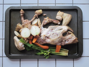 Ze všeho nejdříve si omyjte připravené kuřecí maso. Vyskládejte ho na pekáč a přidejte k němu zeleninu. Všechno zapečte na 170 °C, zhruba 20 - 30 minut. Dokud maso nezezlátne. Tím dodáte vývaru zajímavější chuť a díky opečení masa také barvu.