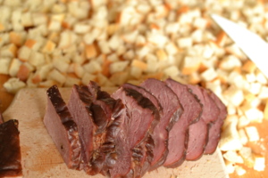 Z bílků ušleháme tuhý sníh. Do žloutkové směsi nasypeme křupavé kostičky pečiva. Promícháme. Přidáme maso nakrájené na kostičky, vychladnutou zeleninu a ještě můžeme dochutit solí a pepřem, případně muškátovým oříškem. Promícháme. Úplně nakonec jemně vmícháme sníh a přesuneme do zapékací mísy.