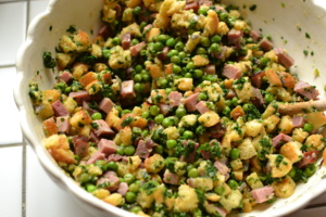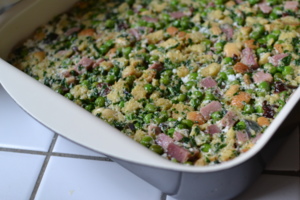 Pečivo použijeme ideálně staré aspoň dva dny. Nakrájíme na malé kostičky, které osmahneme dokřupava na másle. Dáme stranou. Oddělíme žloutky a bílky. Do žloutků přimícháme rozpuštěné máslo a smetanu, dochutíme solí a pepřem. Na másle osmahneme najemno nakrájenou cibulku, ke které přidáme hrášek a špenát, dochutíme solí a česnekem. Chvíli podusíme a necháme vychladnout.