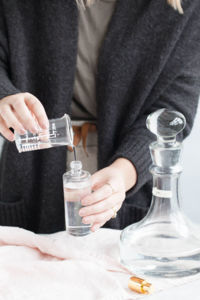A nakonec do lahvičky vlijte vodku. V jakém poměru? 30 ml vodky na 170 ml destilované vody. Množství vody a vodky přizpůsobte velikosti vaší lahvičky.