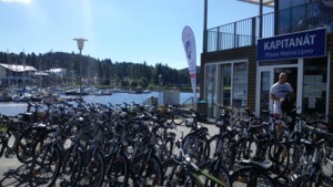 Po krátkém proškolení s námi slečna za pultem během pěti minut vyřídila administrativu s půjčením kola spojenou, dostali jsme brožurku a mapku místních cyklostezek a můžeme vyrazit.