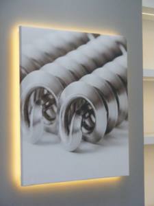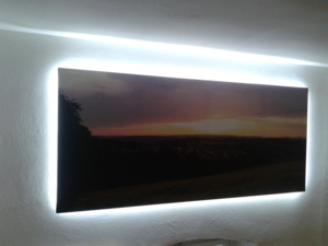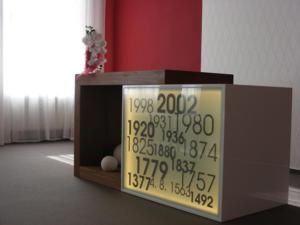 Prvek velkého fotoplátna s novodobou fotografii obce. Tento obraz pomohl opticky zvětšit malý prostor chodby a osvětlení skryté v rámu plátna umožňuje stálé osvětlení tmavého prostoru.
